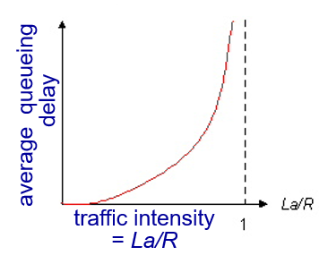 트래픽 강도 ( L*A / R )는 큐잉 지연의 정도를 측정하는데 매우 중요하다 트래픽 강도가 1 이상이면 도착하는 평균율이 전송되는 비율을 초과하게 되므로 큐잉 지연이 기하급수 적으로 증가하여 무한대에 도달한다.